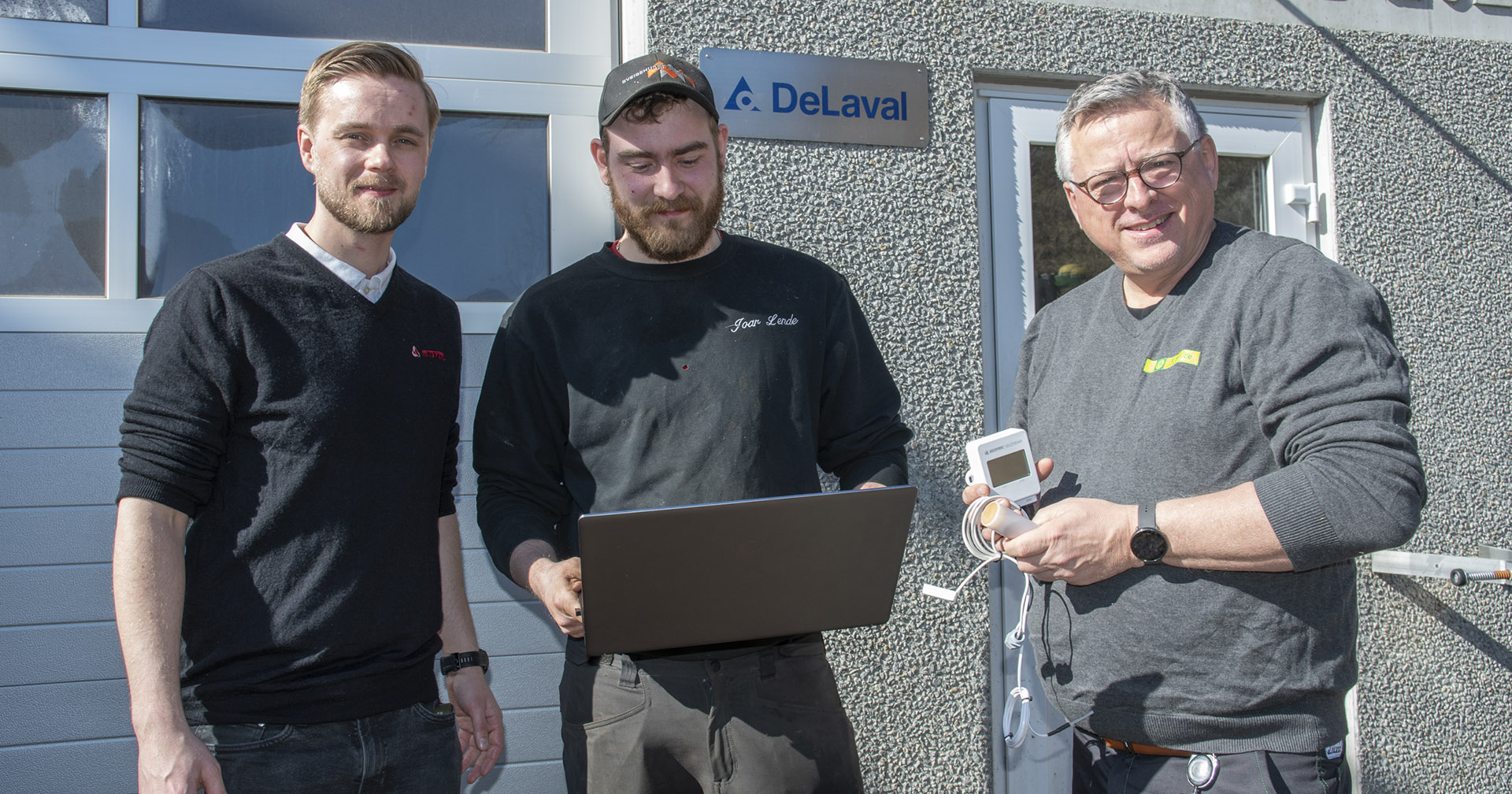 Sensorsjekk:Martin Lien Sæternes frå Elotec f.v., saman med bonde Joar Lende og Jostein Susort frå Felleskjøpet Rogaland Agder.