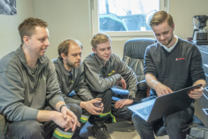 Kompetansebygging: Frå venstre serviceteknikarane frå Felleskjøpet Rogaland Agder, Roy Nøkland, Alf Magne Qvam og Aleksander Grindheim, saman med prosjektleiar Martin Lien Sæternes frå Elotec.
