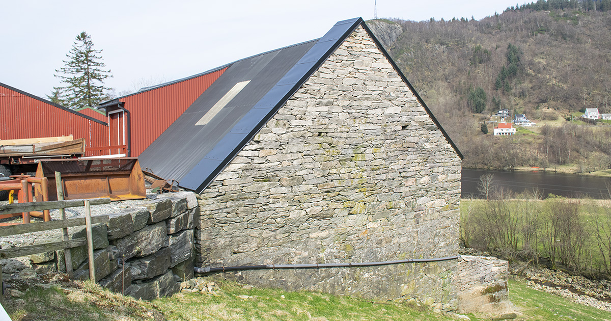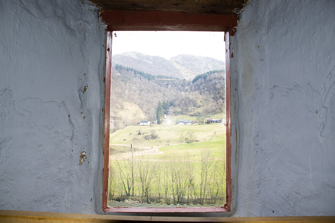 Det gamle båsfjøset har grunnmur frå 1880-talet. Vindauga sit djupt inn i den breie steinveggen og rammer inn landskapet utanfor. Terrenget er så bratt at både låve, fjøs og møkkakjellar ligg på bakkenivå.