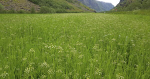 Gjetartaske etter haustattlegg året før. Det gjeld å vere merksam på behovet for bekjemping av både vassarve og gjetartaske som har stått vintergrøne og blømer om våren.