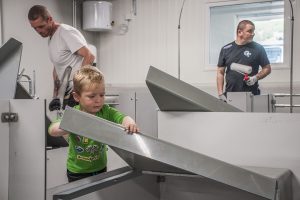 Praktiske løysningar: David demonstrerer korleis dei enkelt kan opna og lukka lokket over gøyma til grisungane. Arbeidarane er i sving med siste innspurt i bakgrunnen.