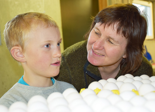 Mormor og morfar har mjølkeproduksjon og eit stort hønsehus med 7.500 frittgåande høner.