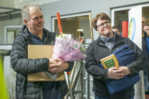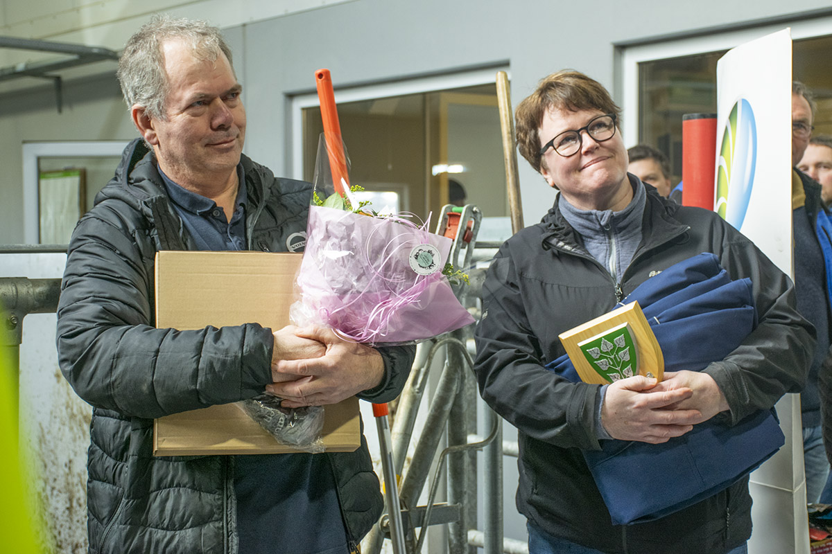 Vel investert: Blomar og plakett frå kommunen vankar på Anne og Tor Gaute Eikeland når dei har satsa såpass som på nytt lausdriftsfjøs.