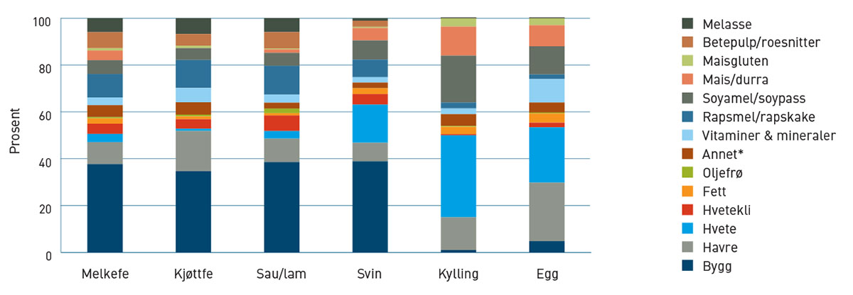 Etter krigen har husdyrnæringa hatt ei stabil utvikling mot færre dyr som produserer meir. Intensiveringa i drøvtyggarproduksjonane auka behovet for meir konsentrert fôr. Samstundes har auka krav til produktivitet gjort at også svin og fjørfe stiller større krav til kvalitet og samansetting av råvarene i kraftfôret. Samla sett er det likevel slik at fôrrasjonen til norske husdyr er basert på norske råvarer. Sjå tabell 1.