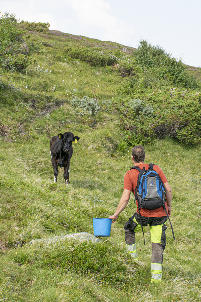 Han har no kastrert alle oksekalvane slik at dei får to beitesesongar før slakt. Kyrne vert sina av tidleg i juli. Rundt 10.-15. juli blir kyr, kviger, kastratar og fjorårskalvane buført til fjells – til fots. Frå september til november ventar bonden 54 kalvingar.