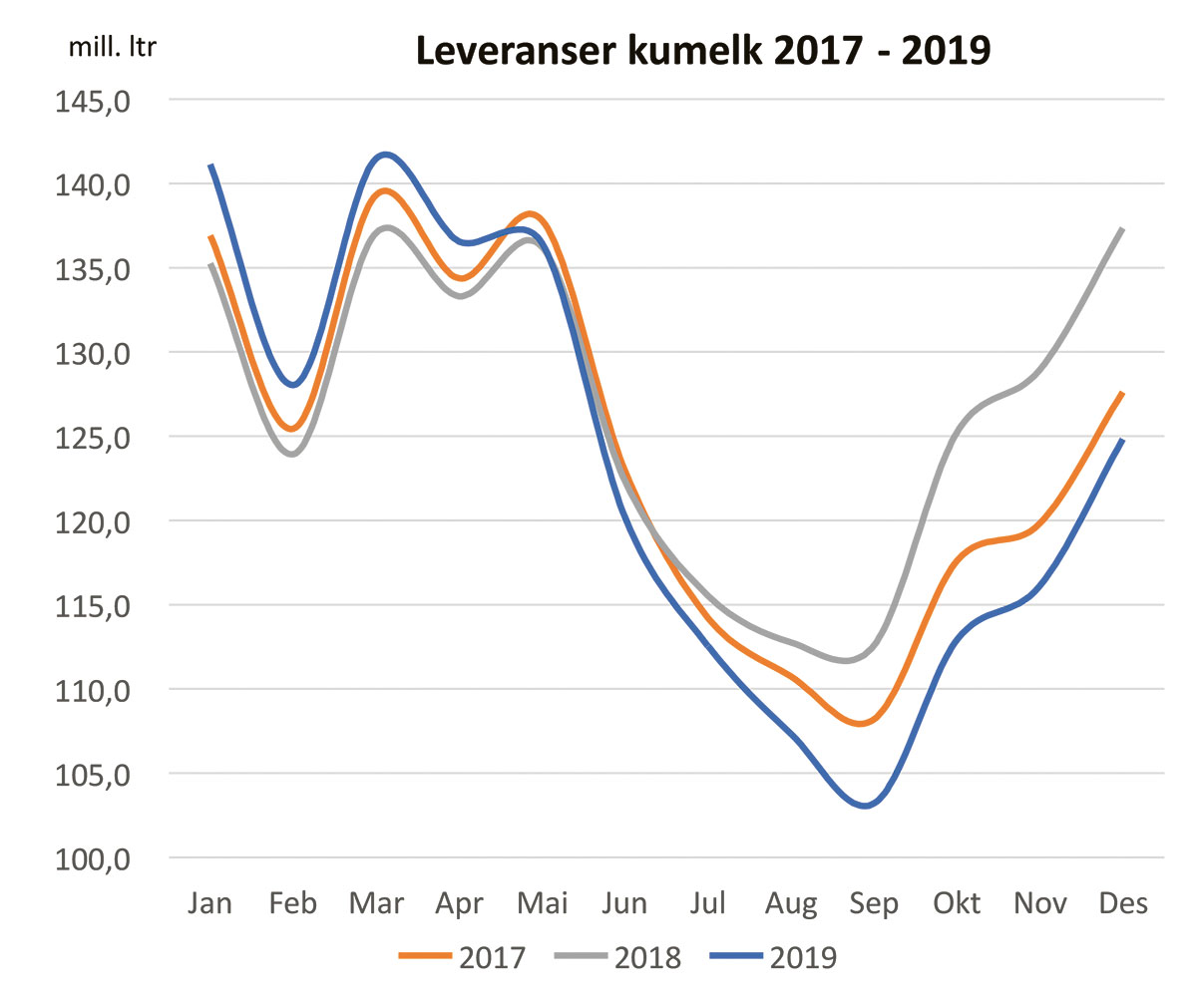 Råstofftilgangen (mjølkeleveransen) til Tine variere mykje gjennom året, med ein topp om vinteren (1.kvartal) og ein botn om sommaren (3. kvartal). I 2019 var prosentvis fordeling på kvartala slik: 27,9 / 26,5 / 21,7 / 23,9. For Tine er den skeive mjølkekurva ei stor utfordring. Kapasiteten på anlegga blir dårleg utnytta og i verste fall kan selskapet risikere å ikkje vere leveringsdyktige på heile varespekteret om sommaren.