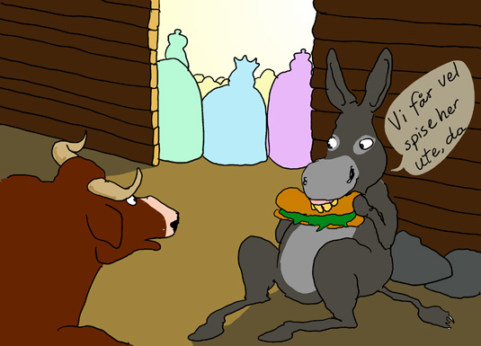 Me kallar det ei julekrybbe, men det er ikkje berre ei krybbe, her er mange folk og mange dyr. Maria og Josef er med, og Jesus-barnet i krybba må sjølvsagt vera på plass, og gjetarane og vismennene og sauene er med. Og så kjem dei dyra som kanskje er litt overraskande, ein okse og eit esel er òg med. Det står ingenting i forteljingane om Jesu fødsel at det var eit einaste dyr med rundt krybba. Sauene har kome med sidan gjetarane er med, dei var jo dei fyrste som kom for å æra barnet, så då var det vel naturleg å ta med sauene. Men kor kjem oksen og eselet ifrå?