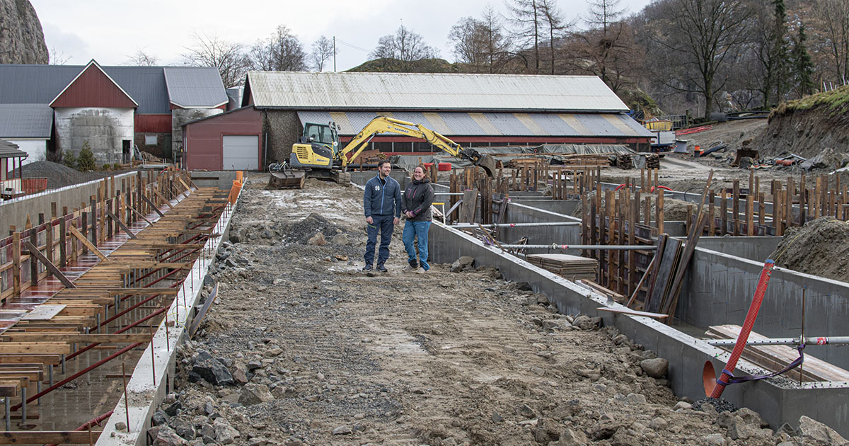 Ein ny start: Gro og Thore gler seg til lausdriftsfjøset er klart. Dyra får god plass, og bøndene ein fleksibel kvardag. Bøndene står på det som skal bli fôrbrettet.