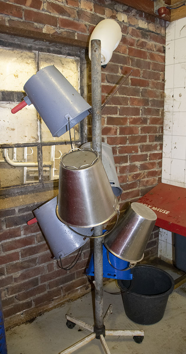 Stativ: Rengjør kalvebøtter og annet utstyr som brukes til kalvefôring og heng det opp til tørk. Har du liten plass kan et heimelaga stativ være en rimelig og enkel løsning. Foto: Liv Kristin Sola