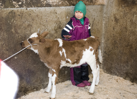 Asgeir Pollestad, far til Pauline, fortel om kyr og mjølk. Ester Pollestad, mor til Pauline, forklarer korleis dei fôrar kalvane. Litt mykje fakta for somme, som heller vil leika og boltra seg i halmen og på fôrbrettet.