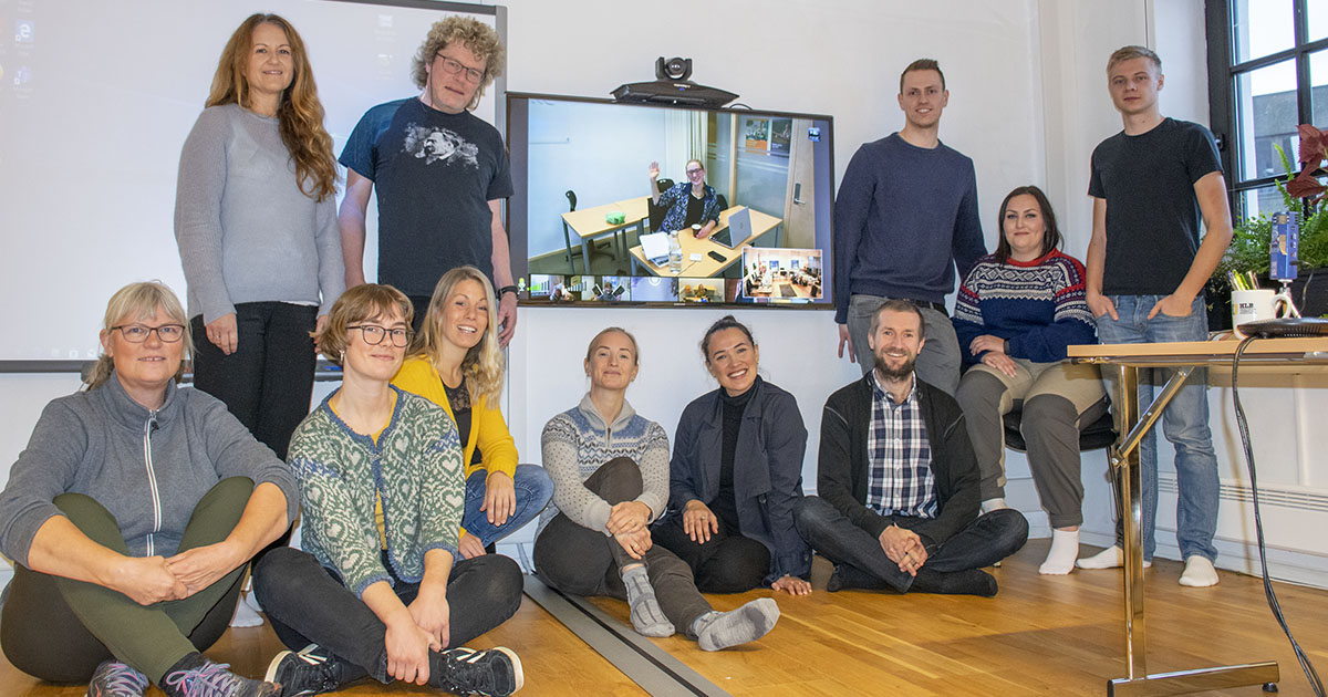Første time: Ståande bak f.v.: May Britt Vikingstad, rektor Dag Jørund Lønning, Simon Ritland og Jarle Jørgensen. Sitjande, f.v.: Anne Grete Bjørknes, Nanna Bjelland Isdal, Marte Dale, Anniken Fure Stensrud, Helene Sonkunkaew Tråsavik, Magne Jacobsen, Helene Nordbø Hansen. Marte Olsen på skjermen.