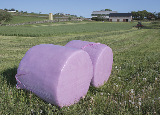 Svihus driv maskinstasjon, og fortel om kundar som har etterspurt den rosa plasten, medan andre er skeptiske til eigenskapane til den nye varianten av rundballepakking.