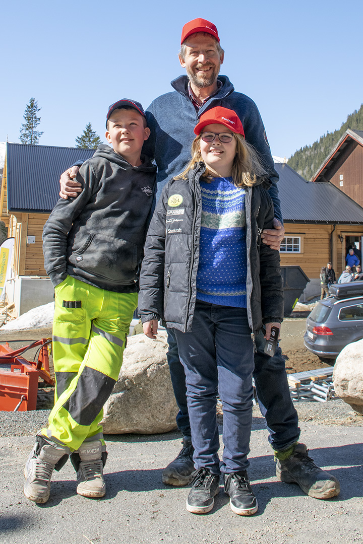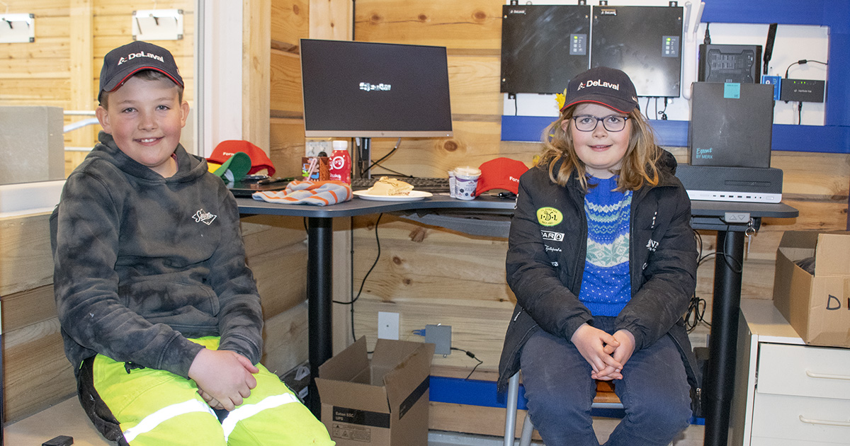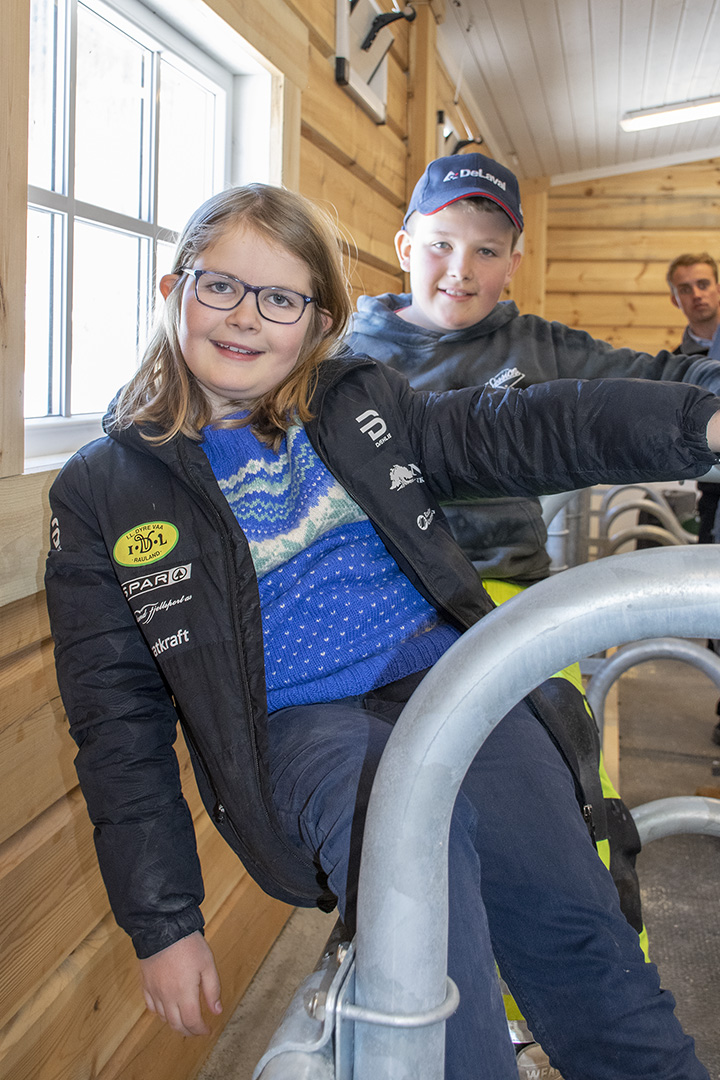 Aasne (snart 11) og Haakon (12) er nøgd med det nye fjøset og at så mange kom for å sjå. Storesyster Ingrid (14) var på skulen då fjøset vart opna.