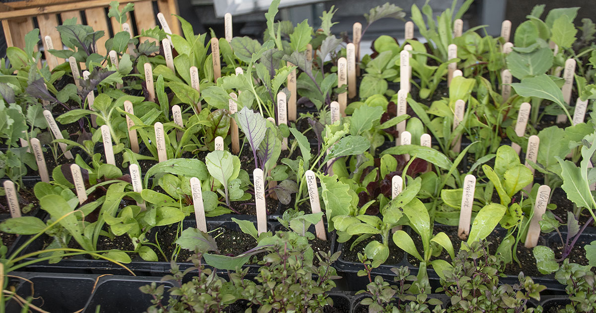 Klare for pallekarmen: Det er fortsatt litt tidleg i sesongen for grønsakssal. Hilde Løge selde planter klare for pallekarmen. – Det er eit auka fokus på sjølvforsyning, seier ho.