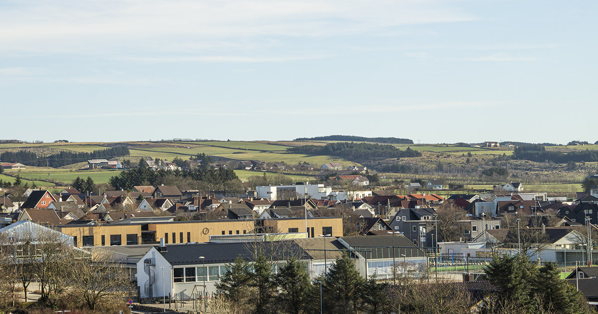 Frå sentrum: Bilete er tatt frå Varhaug sentrum i retning Elgane. Vindkraftverket er planlagt til venstre for skogholtet øvst i midten i biletet. Foto: Sjur Håland