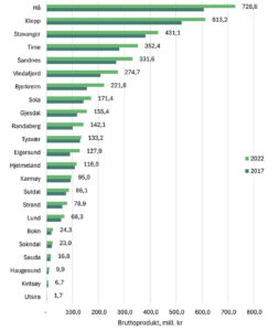 Hå på topp: Verdiskaping frå jordbruket i kommunane i Rogaland i 2022 og 2017 (i 2022-kroner), bruttoprodukt, mill. kr.