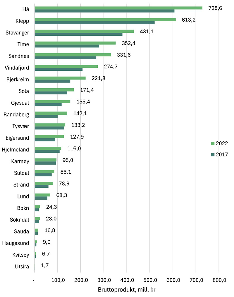 Hå på topp: Verdiskaping frå jordbruket i kommunane i Rogaland i 2022 og 2017 (i 2022-kroner), bruttoprodukt, mill. kr.