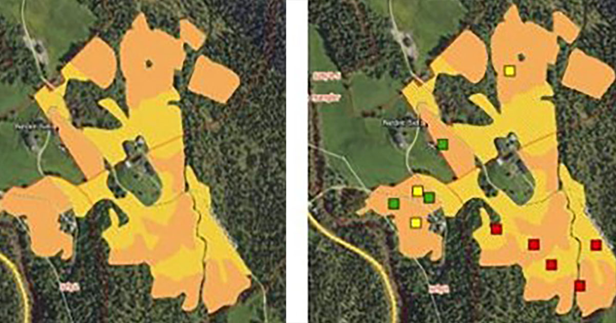Før og etter klassifisering: Figurane syner areal ute av drift i NIBIO si kartløysing, før og etter klassifisering. Skraverte areal i figuren til venstre syner at det ikkje er søkt produksjonstilskot på aktuell teig. Oransje areal er fulldyrka og overflatedyrka mark. Gule areal er innmarksbeite. I figuren til høgre er det lagt grøne (klasse 2), raude (klasse 3) og gule symbol, som syner kva for oppfølging kommunen skal ha. Gult symbol betyr at arealet er uavklart og kommunen må gjere meir undersøkingar av arealet før endeleg klasse kan settast. Kjelde: Nibio og Statsforvaltaren i Vestfold og Telemark