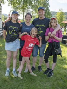 Viktig for bygda: Familien Åbø frå Hjartdal var alle med i konkurransen – og på dugnad, og Signe (9) var Slåttefestivalen sin yngste deltakar. F.v. Ingrid, Renate, Signe, Arnt Helge og Tone.