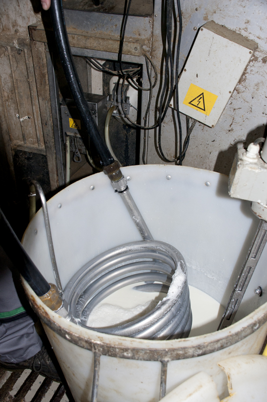 Kjølesløyfe kobla til vannsløyfa som forsyner drikkekara i fjøset med vatn. Kaldt vatn gjennom spiralen kjøler ned kalvemjølka til mjølkefôringsautomaten.