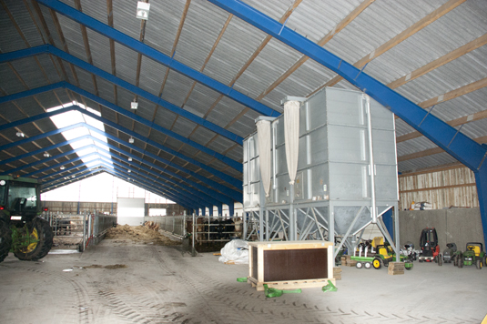Oversikt over ammekuavdelinga i nybygget. Tre ulike kraftfôrtankar, med Formel Biff i to og Formel Favør i den siste. Ein heimesnekra kasse til oppbevaring eller transport av mindre mengdar kraftfôr.