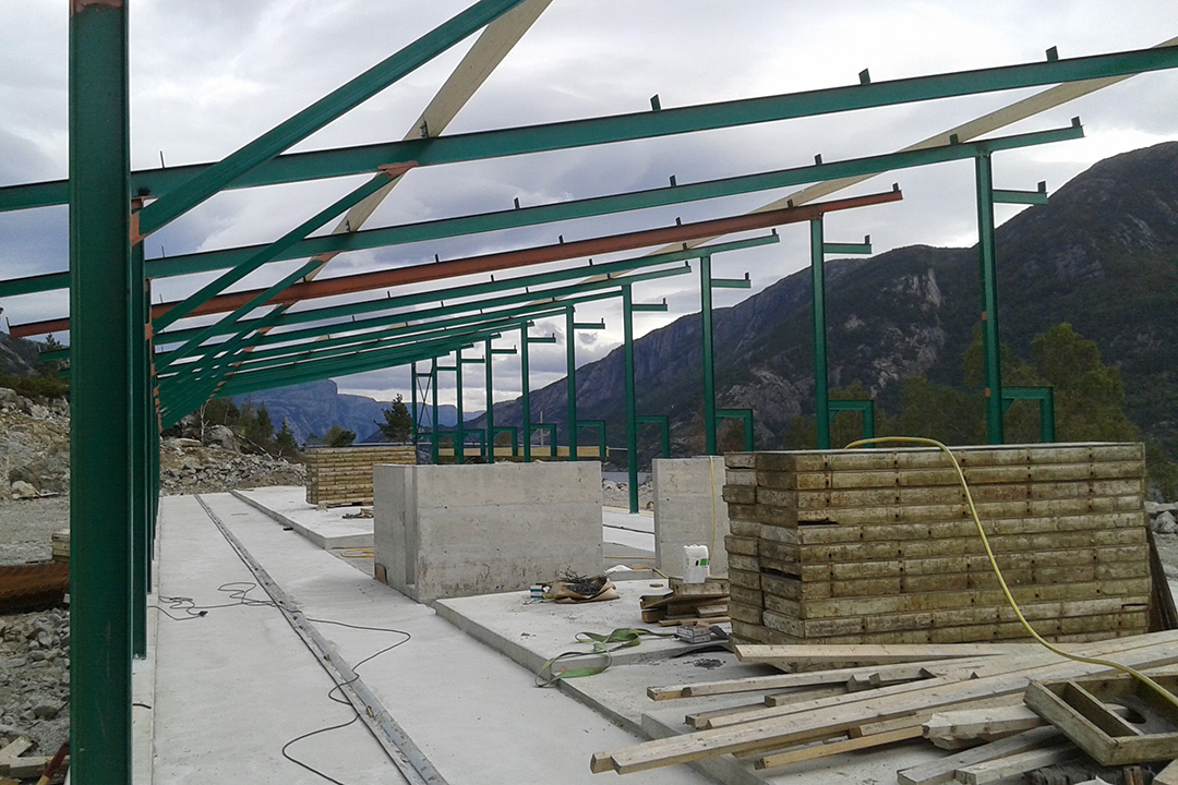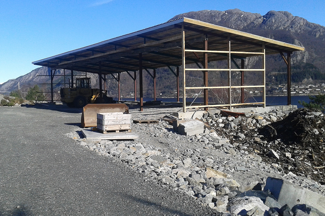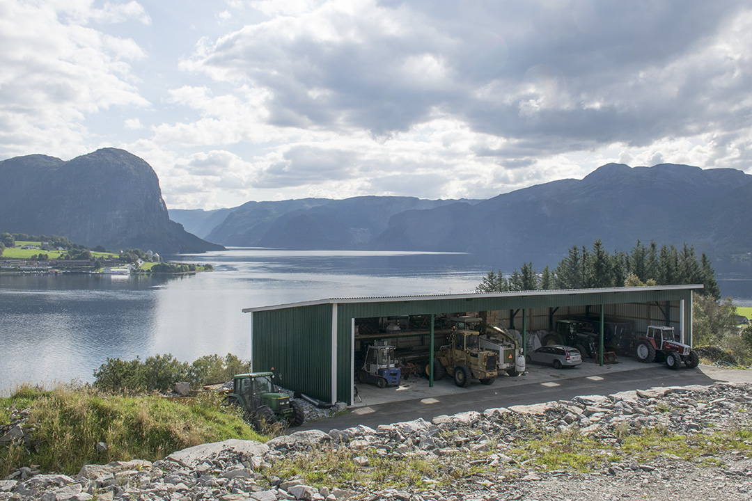 Langt og smalt og heilt ope. Fjøset ligg på fjellknausane over ferjekaia på Oanes. Heilt ved munningen av Lysefjorden.