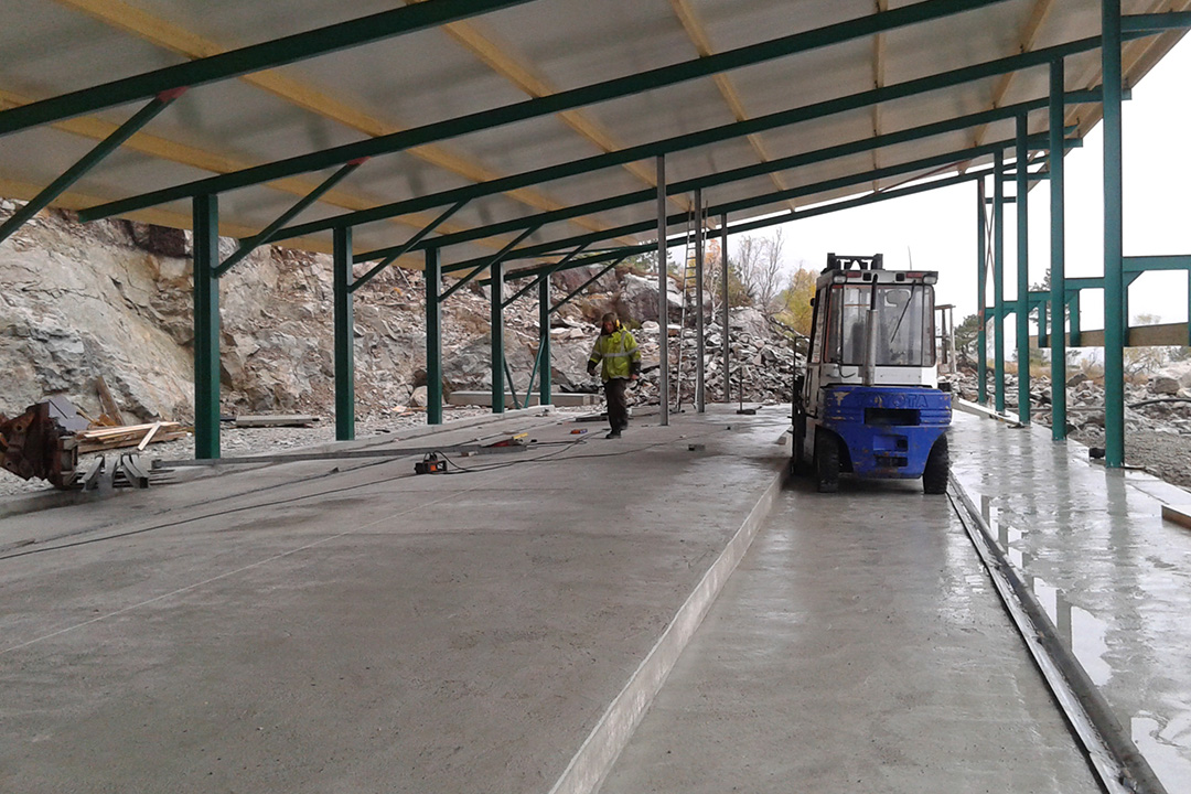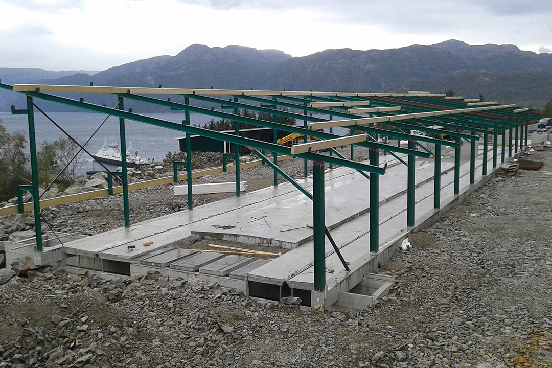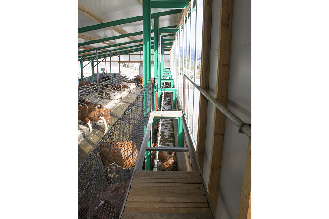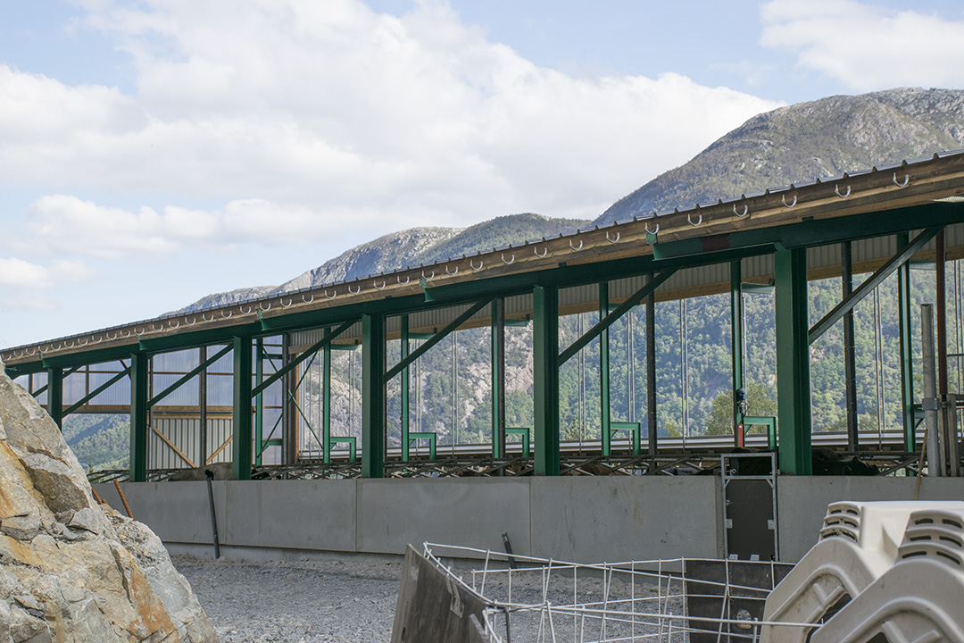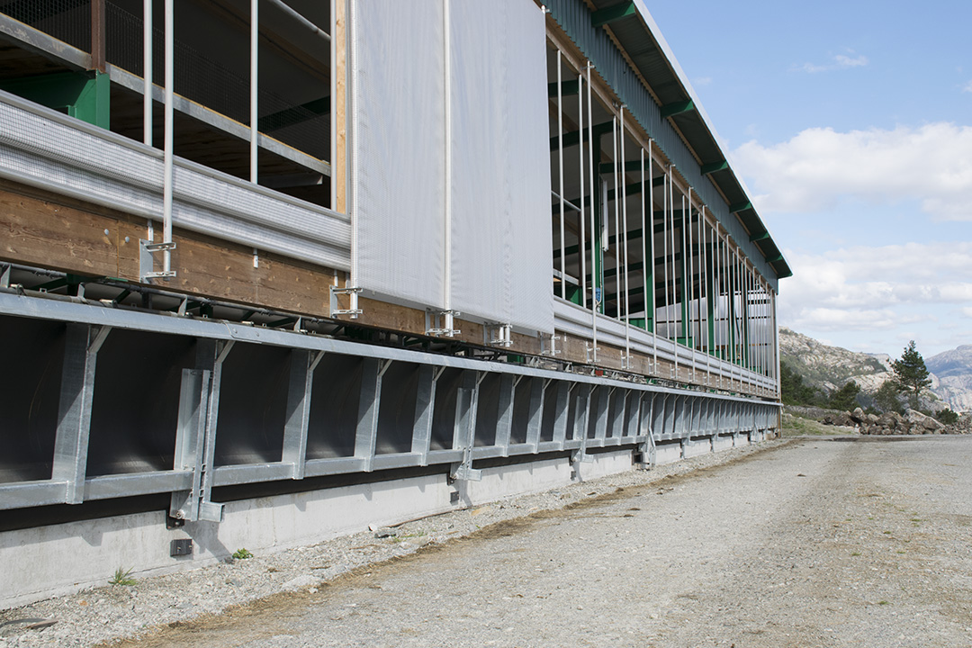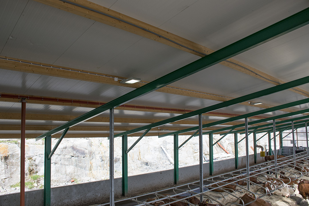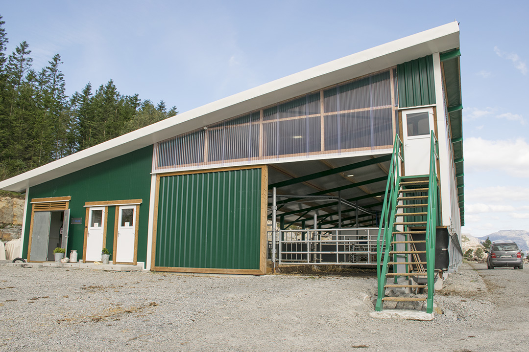 Det smale fjøset har skråtak med 10 graders helling. Frontveggen er 6 meter og baksida er 4 meter høg. Dimensjonane på taksperrene er tona ned og dei har spart kostnaden med kip i taket. Utvendig fôrbrett reduserer arealet med 4 meter per lengdemeter. Ingenting er støypt ned i golvet. Slik kan dei lettare gjera endringar om det vert behov.