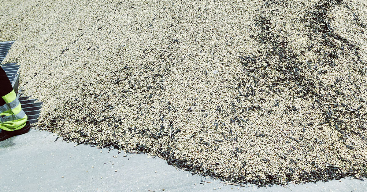 Frå Agder: Desse åkerbønnene, levert frå Agder, gjekk inn i kraftfôrproduksjonen på Kvalaberget. Hogne Prestegård og Rolf Bauge leverte totalt 30 tonn åkerbønner til FKRA. Foto: Odd Kåre Rugland