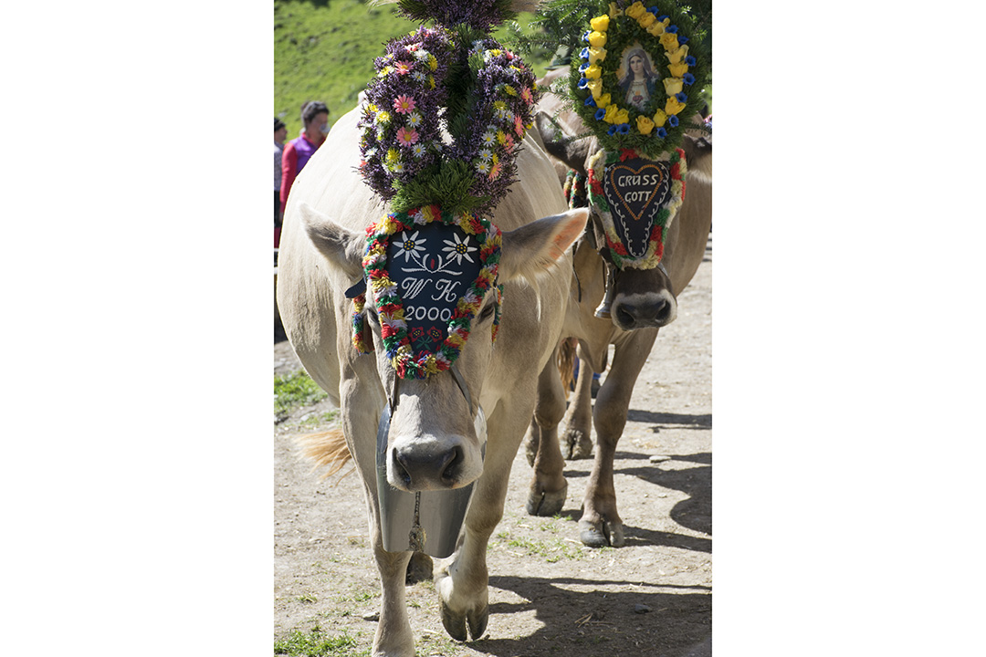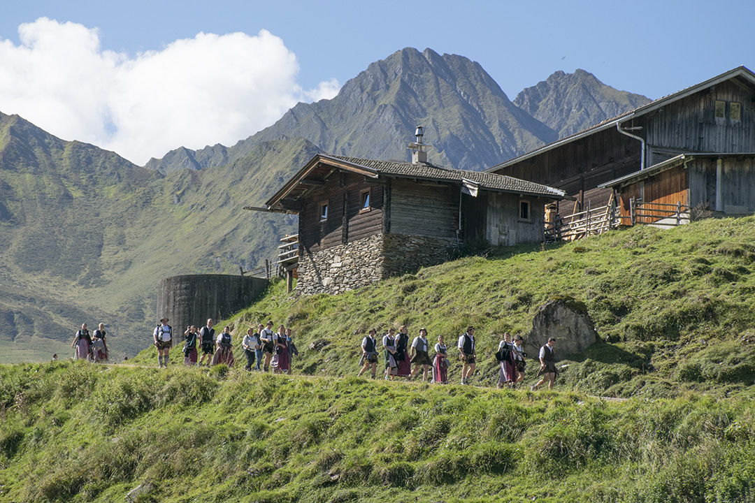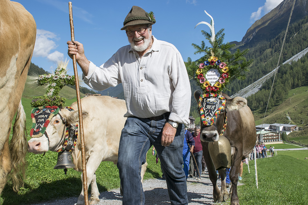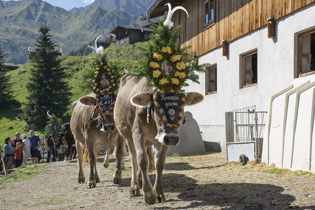Følget av kyr og bønder er ferdig pynta. Ei etter ei slepp kyr og kviger ut frå dei tre fjøsa. Bøndene går midt i flokken, gjennom skogen, på gardsvegane gjennom det grøne landskapet og gjennom gatene, forbi dei mange turisthotella og tradisjonelle bygningane i landbyen Hintertux.