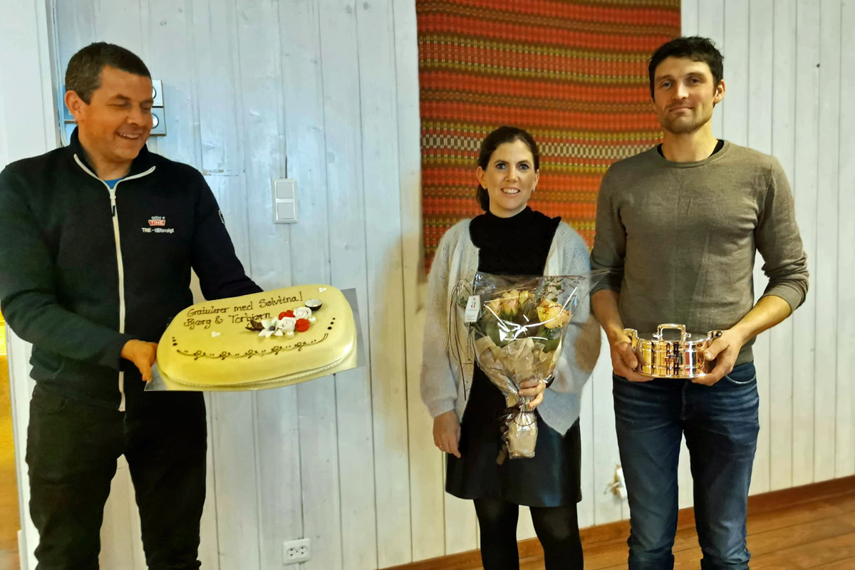 Sølvtina: Tidleg i november, medan det framleis var lov å samlast, fekk Bjørg og Torbjørn Madland overrekt Sølvtina under ei produsentlagssamling i Gjesdal. Gudmund Edland, leiar av produsentlaget, står for overrekkinga. Foto: Gjesdal produsentlag.