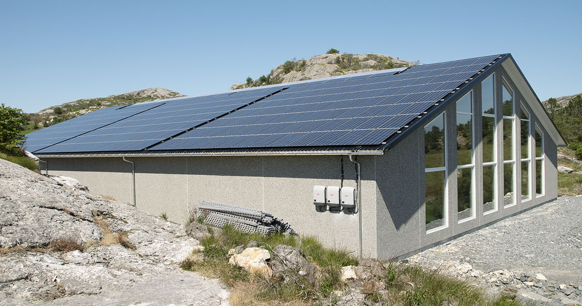 Lønsame straumtak?: Solcellepanel montert på taket på maskinhuset til Magnar Fjeldheim i Vindafjord.