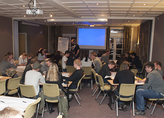 Gruppene arbeida ihuga med oppgåva. 60 personar fordelt på fleire grupper, i ivrig idémyldring.