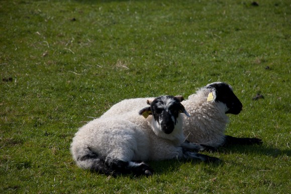 To sauer av skotsk svartfjes slappar av på grøn mark.