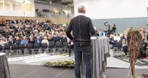 Stinn brakke: Frå Varhaugmøte 2024. Bjørn Gimming bak talarstolen.