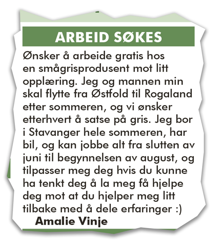 Sommaren 2014 trykte Bondevennen ein tilsynelatande uskyldig førespurnad under på annonseplassen «Frå bonde til bonde». Ei ung kvinne søkte om å få praksis i grisehus. Saman med mannen skulle ho flytte til Rogaland for å satsa på gris. Ein bonde i Rogaland tok kontakt, og sleppte henne inn i fjøset. Ho fekk også koma inn hjå bønder fleire andre stader i landet. Resten av historia kjenner me. Resultatet fekk me sjå i NRK Brennpunkt-dokumentaren «Svineindustriens hemmeligheter» førre veke.