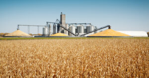 Corn Harvest and Processing Silos by Autumn Agricultural Farm Field