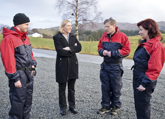 Familien Edland tok i mot landbruksministeren med glede. (F.v.) Steinar Edland, Sylvi Listhaug, Olav Edland og Lillian Edland.