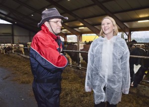 Med fleire pressefolk på slep fortalde han Sylvi Listhaug om kvardagen i fjøset. I det romslege lausdriftfjøset er det 100 mjølkekyr og 180 kalvingar i året.