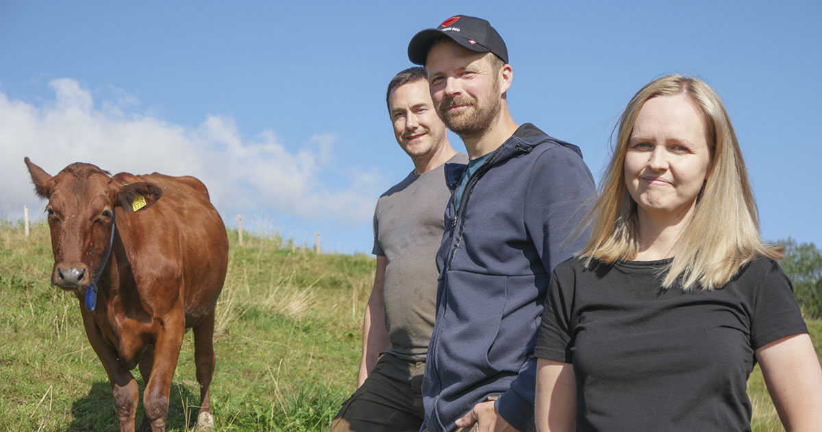 Ekte vare på beite: Mjølkebøndene er inspirerte av siderprodusentane si suksess-satsing. Med mjølk frå kyr i Øystese, blir det laga lokal steikeost. Torkel Hovland er ystar, Cato H. Kjosås styreleiar og Gøril Kjosås tek seg av marknadsføringa av den nye Eldosten.