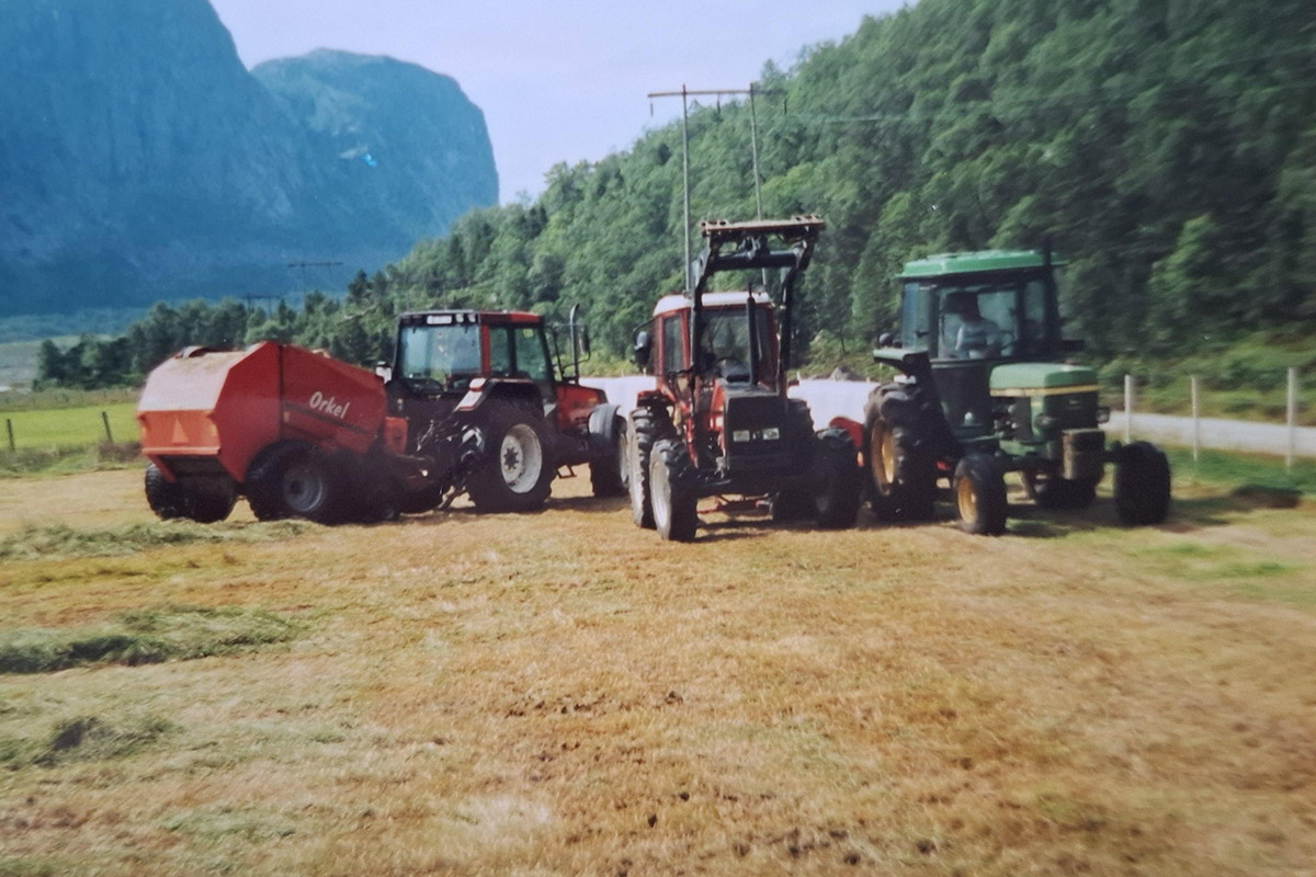 Rundballepressing: Stadig meir å hausta. Det første kulturbeitet i bakgrunnen.