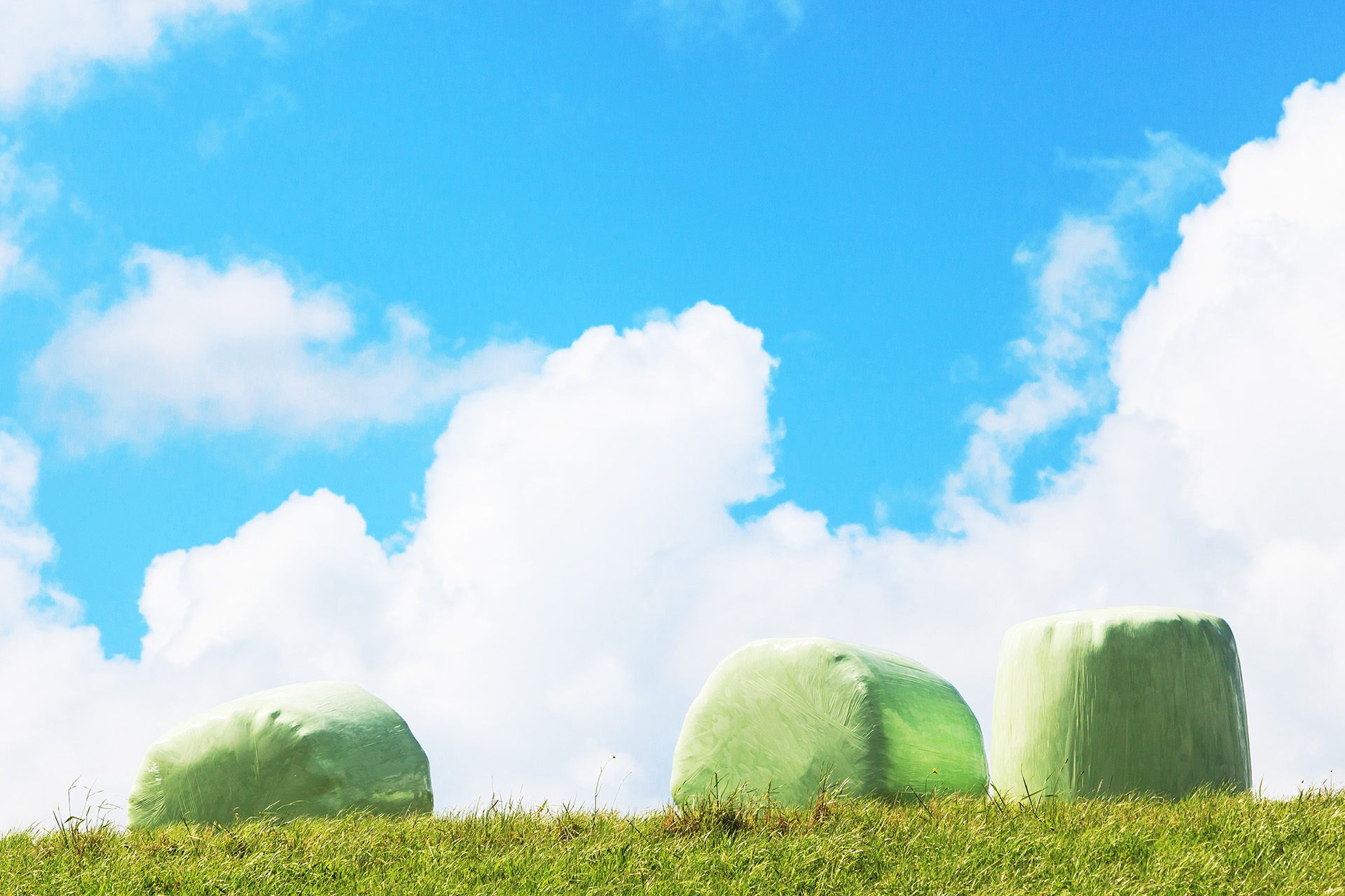 Denne plasten er det fullt mulig å lage fra fornybare råstoff. På gården vår har vi valgt å teste ut dette. Den nedbrytbare plasten har eksakt samme egenskap som sine fossile alternativer. Ballene har imidlertid også grønn farge, noe som gjør at det har blitt registrert noe høyere temperatur på innsiden enn i hvite rundballer. Om dette blir et problem, er det heldigvis mulig å endre farge. Den fornybare plasten kan like gjerne være hvit, som den fossile.
