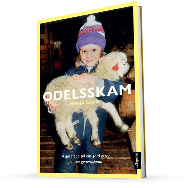 Gje slepp: Bokomslaget på «Odelsskam» viser ei lita Maria Lavik som ivrig medhjelpar i sauefloren på garden i Eksingedalen. «Odelsskam - å gje slepp på ein gard etter femten generasjonar», 2024, Samlaget