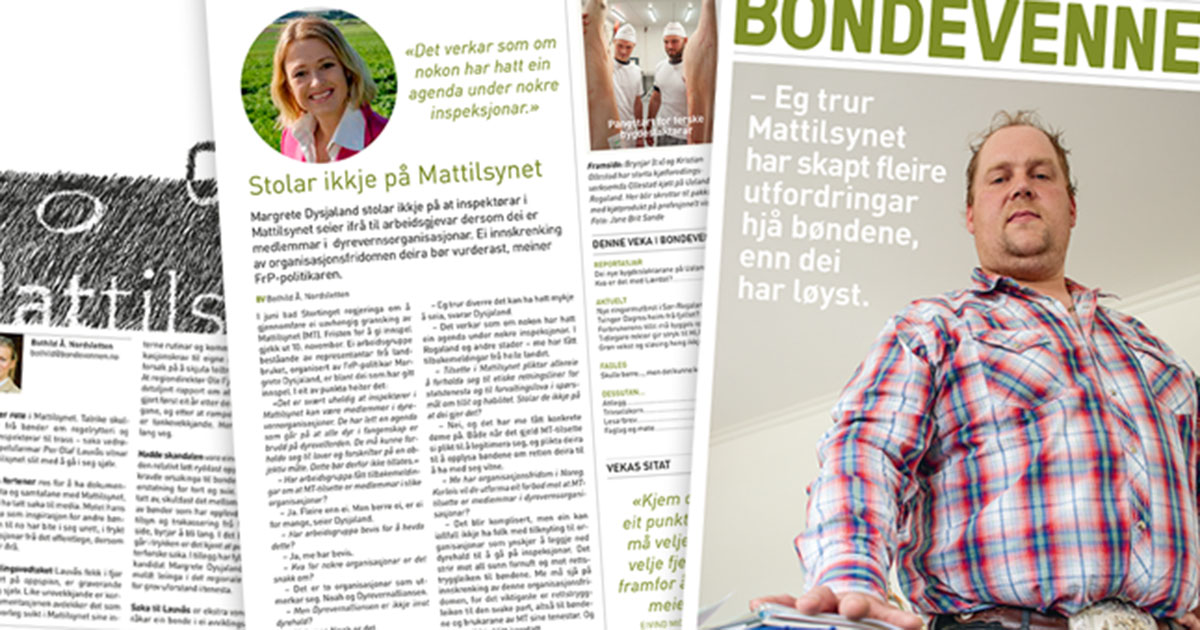 - Tidligere rådgiver i Landbruks- og matdepartementet, Margrete Dysjaland (Frp), opplyste til Bondevennen 15. november at hun «stolar ikkje på at inspektører i Mattilsynet seier ifrå til arbeidsgjevar dersom dei er medlemmer i dyrevernsorganisasjonar.»