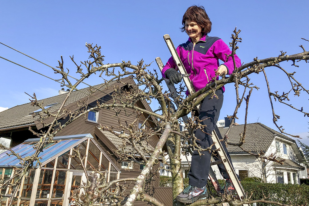 Frå toppen av epletreet strittar nokre «pisker», – dei må vekk. Eg har sagt det før, men seier det på ny: Om du bare skal planta ein ting i år: Plant eit epletre! Så mykje glede for så lite arbeid.