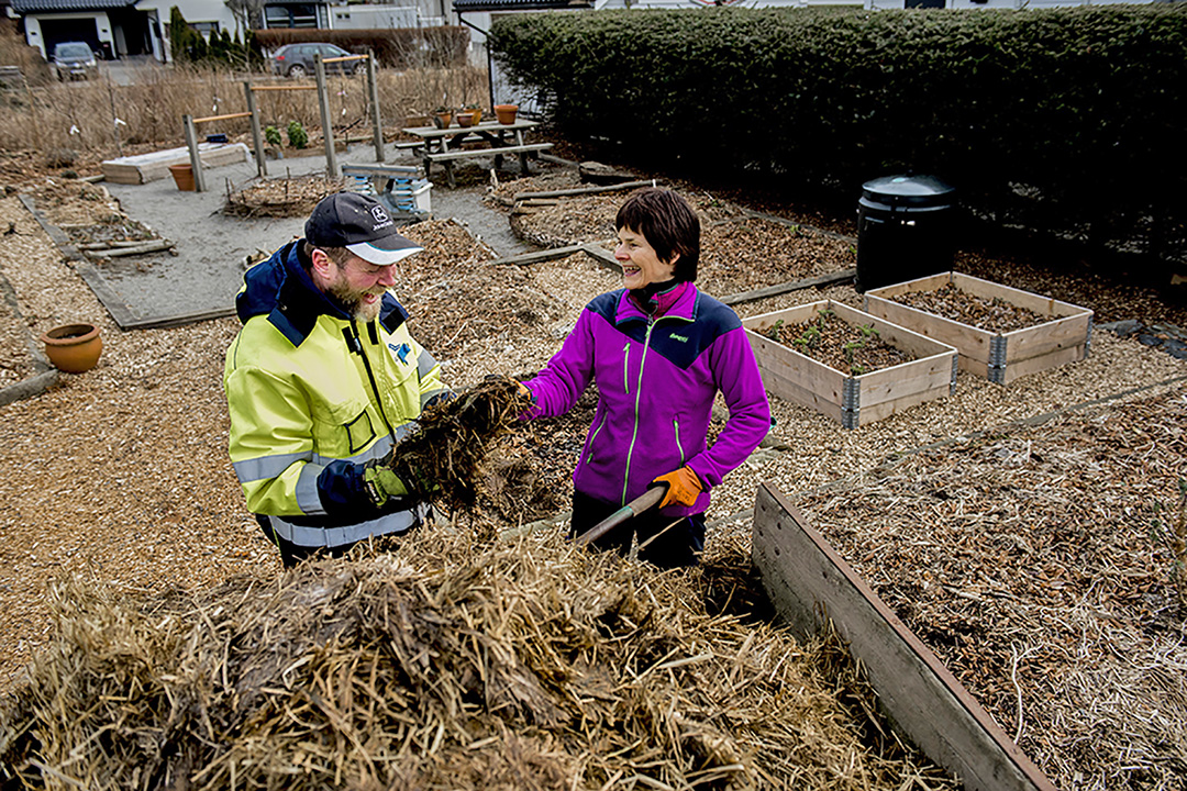 Eg fjerna overgrodde buskar og bjørkekratt frå den gamle leikeplassen tvers over gata og laga kjøkkenhage. I staden for å kjøpa eit lass med jord, bygde eg opp beda av gratis «avfall»: Der det ikkje var jord frå før, bare grus og ugras, dekka eg fyrst med eit lag papp/aviser. Så lessa eg på med kvistar og flis i botnen, deretter lauv (hadde fylt mange sekker om hausten), kompost frå varmkompostbingen min (mat- og hageavfall), tang og tare, gammal hestemøkk og sauelort, litt jord frå min eigen kjøkkenhage (stinn av meitemark) og eit tjukt lag med gras på toppen. Fort gjort, null graving! Der det var jord frå før – trong eg ikkje papp og kvistar i botnen. Der bare blanda eg inn møkk og tare og toppa med gras frå rundballen.