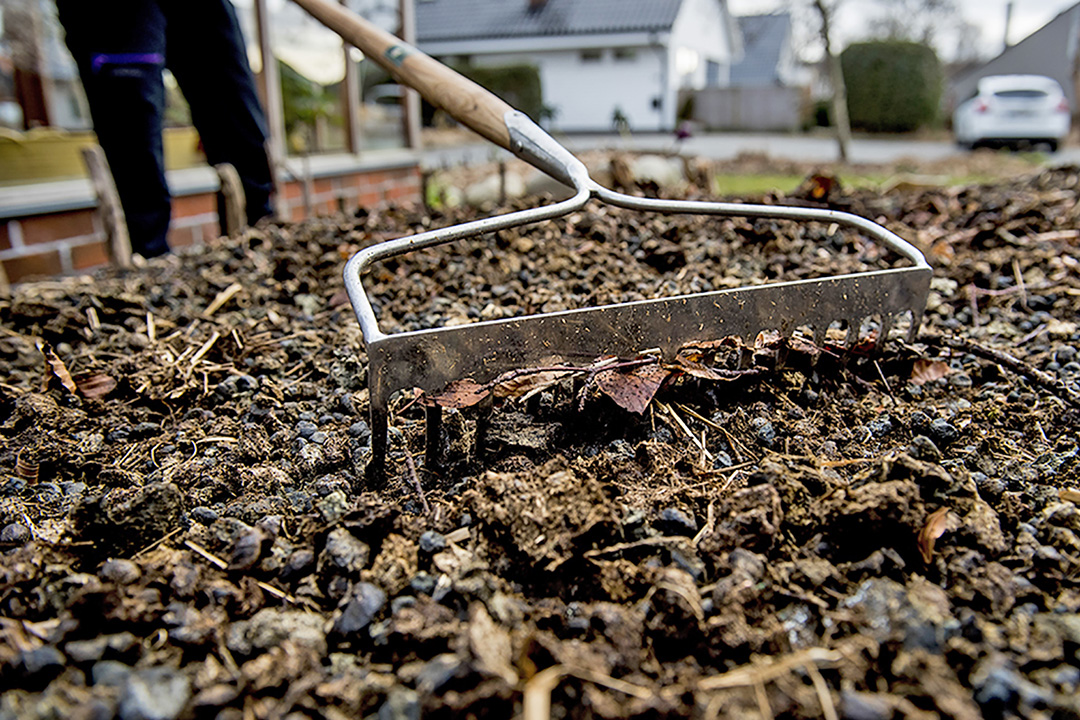 I min eigen hage dekka eg med sauelort i slutten av februar. Beda her er djupe nok, mens i Leikeplasshagen må det «byggjast» meir jord.