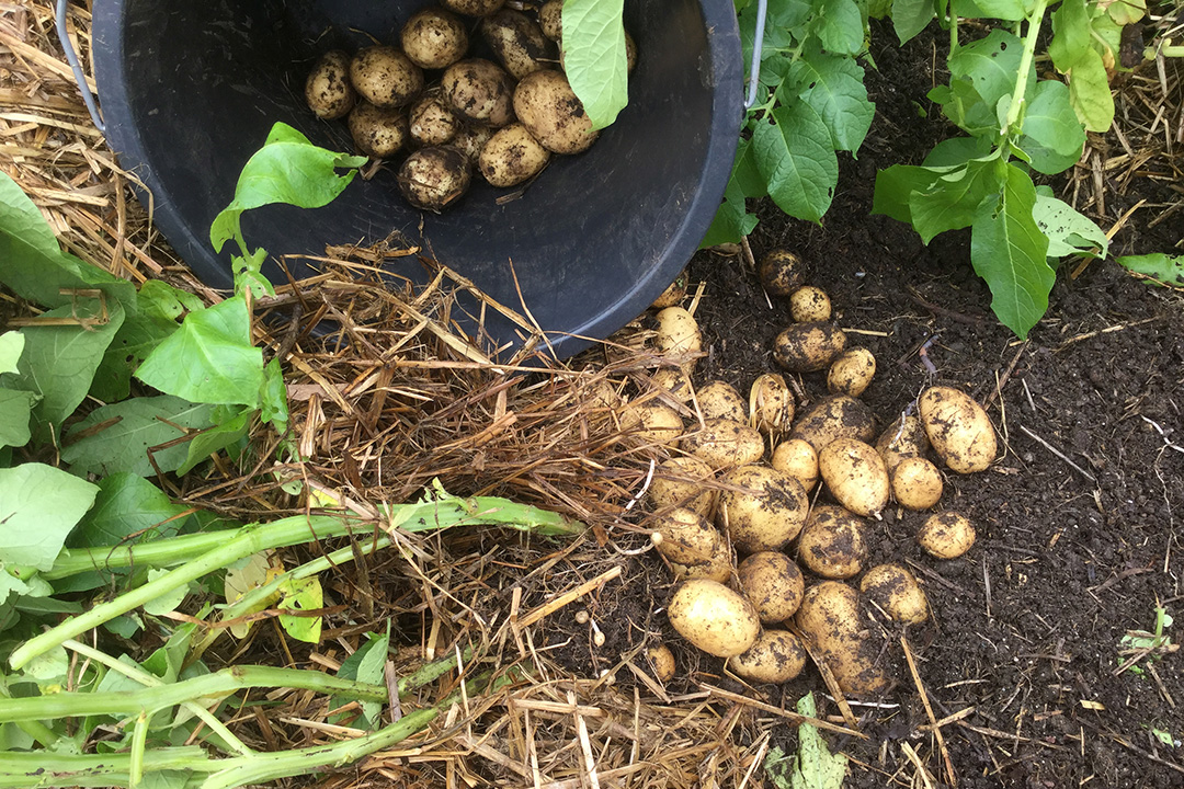 Jordeple passar svært godt til å dyrka i slike bed. Etterkvart som dei vaks, la eg bare på nye lag. Då me i starten av juli lurte på om dei var klare, var det bare å grava til sides litt gras. Der lyste store gule jordeple mot oss. Me kunne plukka inn til grytene utan å spa opp heile planten. Dermed fekk dei mindre knollane veksa seg store.