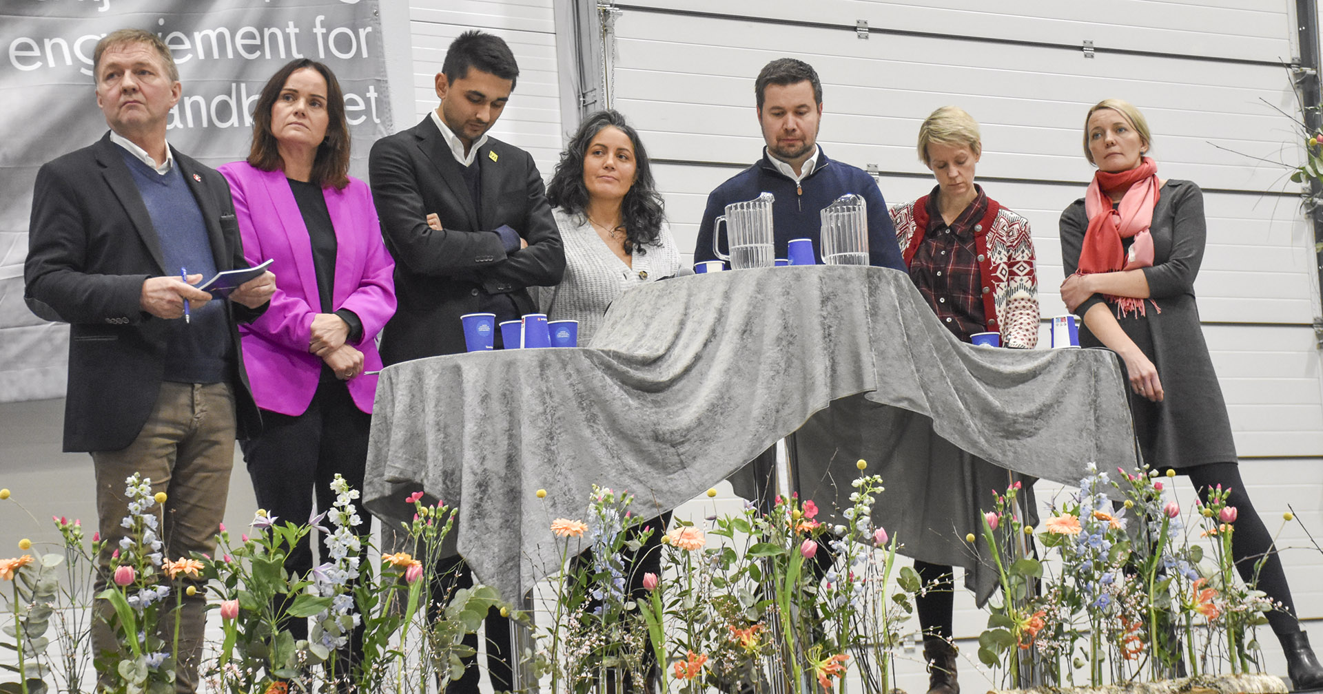 Panelet: Det viktigaste landbruksmøte blir det kalla, likevel var det berre Sp og Ap som sendte sine landbrukspolitiske talspersonar til Varhaug. F.v. Pål Morten Borgli (Frp), Margret Hagerup (H), Jonas Andersen Sayed (KrF), Naomi Wessel (R), Geir Pollestad (Sp), Ingrid Fiskaa (SV), Solveig Vitanza (Ap).