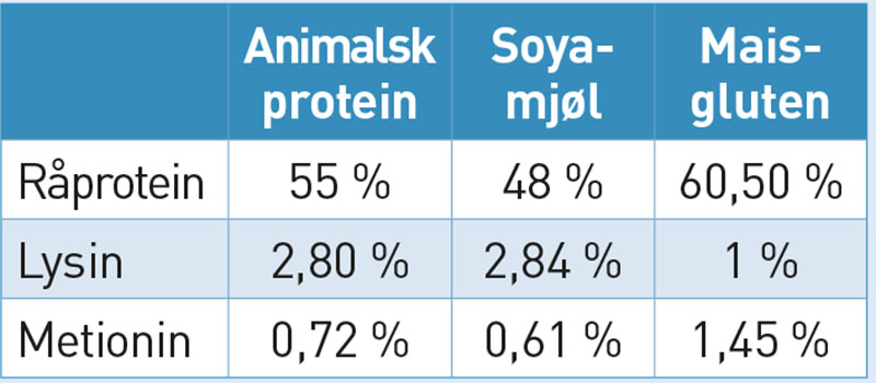 Aminosyreprofilen spiller en viktig rolle og gjør at noen proteinkilder er mer optimale enn andre. Ta for eksempel sammenligningen av animalsk protein, soyamjøl og maisgluten. Alle tre har høyt proteininnhold og er gode kilder til protein, men maisgluten skiller seg ut fra de to andre med annet innhold av to viktige aminosyrer, lysin og metionin. Tabellen viser hvorfor maisgluten til tross for sitt høye proteininnhold gjerne vil måtte overdoseres med hensyn til dyrenes krav til protein for å oppnå dyrenes krav til lysin. Den samme tabellen viser også hvorfor soyamjøl er attraktivt som proteinkilde da det har svært lik lysininnhold som animalsk protein.