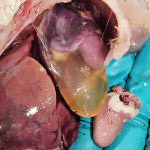 Avlivet kylling med væske i hjerteposen, perikardvæske.